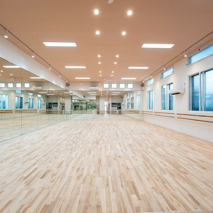 床材は練習中の脚への負担を軽減する特注のリノリウムで柔らかい床に仕上げています。