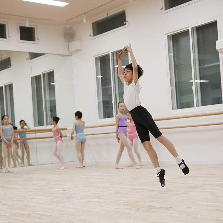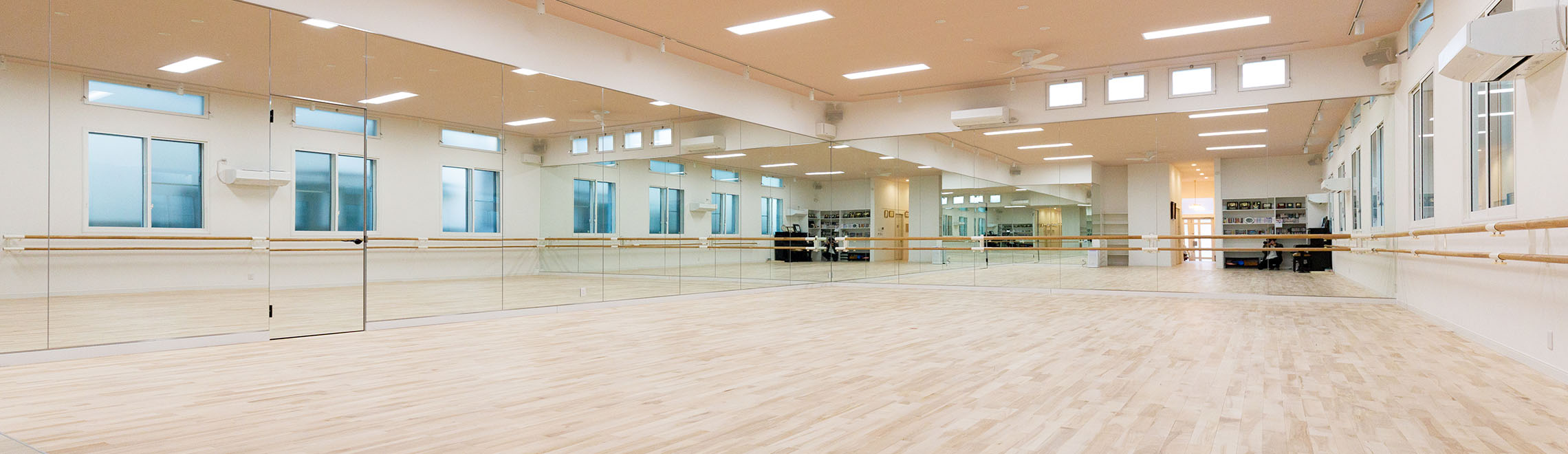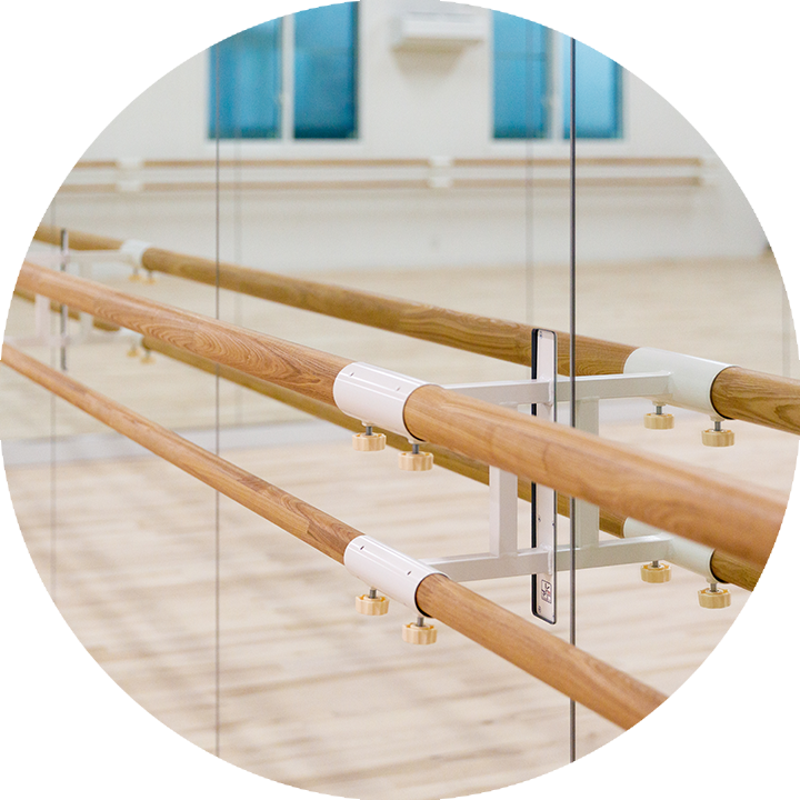 真新しいスタジオは3面鏡張りの広々とした環境。高い天井からは光が豊かに差し込み、床はバレエに適したしなりを生む無垢材を使用して足に優しい設計に。レッスンに集中できる設備を整えた最新のスタジオです。