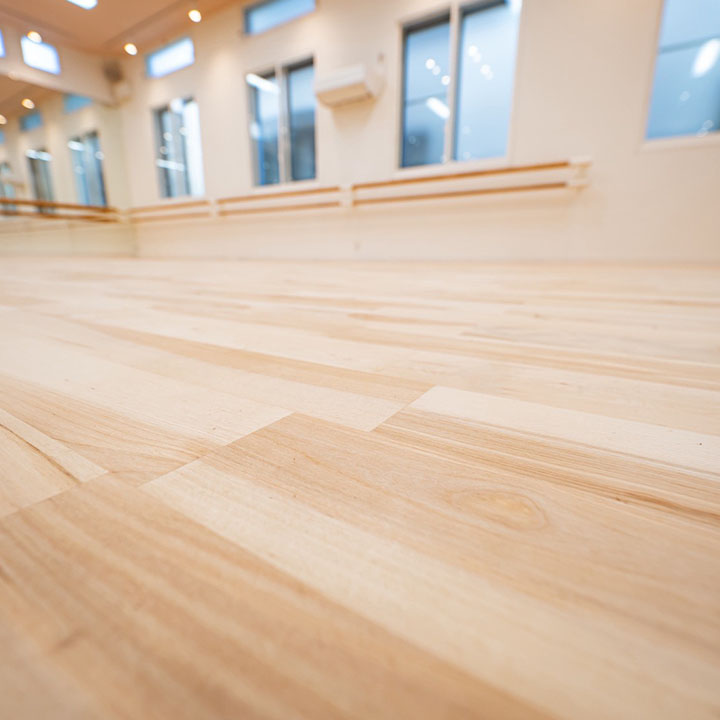 床材は練習中の脚への負担を軽減する特注のリノリウムで柔らかい床に仕上げています。